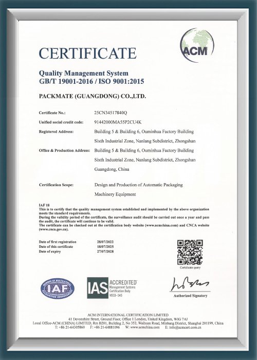 Packmate (GuangDong) Co., Ltd. is a high-tech enterprise with over 33 years of experience in packaging equipment innovation and manufacturing. We focus on developing intelligent, high-end packaging machinery that complies with EU and GMP standards and serves pharmaceutical, health product, and food industries worldwide. Backed by strong engineering capabilities, precision manufacturing, and continuous technological advancement, we deliver stable performance and long-term production value for global customers.